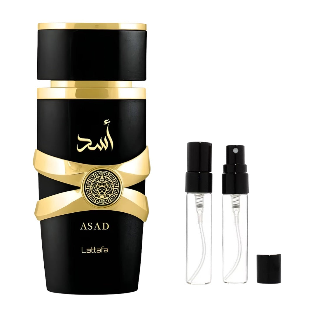 Introducing Asad Lattafa:Decant, available in 5ml or 10ml sizes. This exclusive fragrance is perfect for on-the-go with its compact size and long-lasting scent. Experience the luxury and sophistication of Asad Lattafa with every spritz.